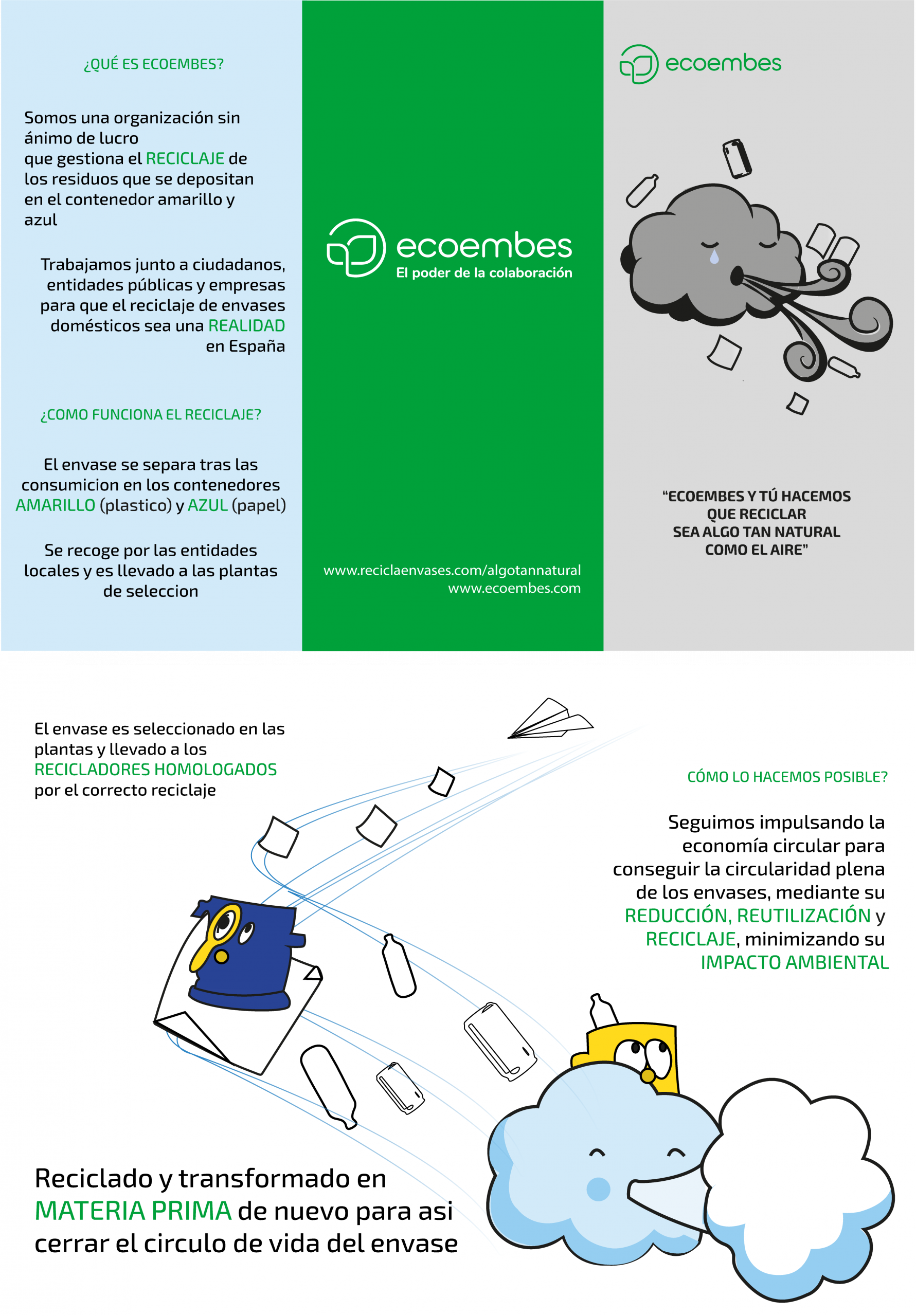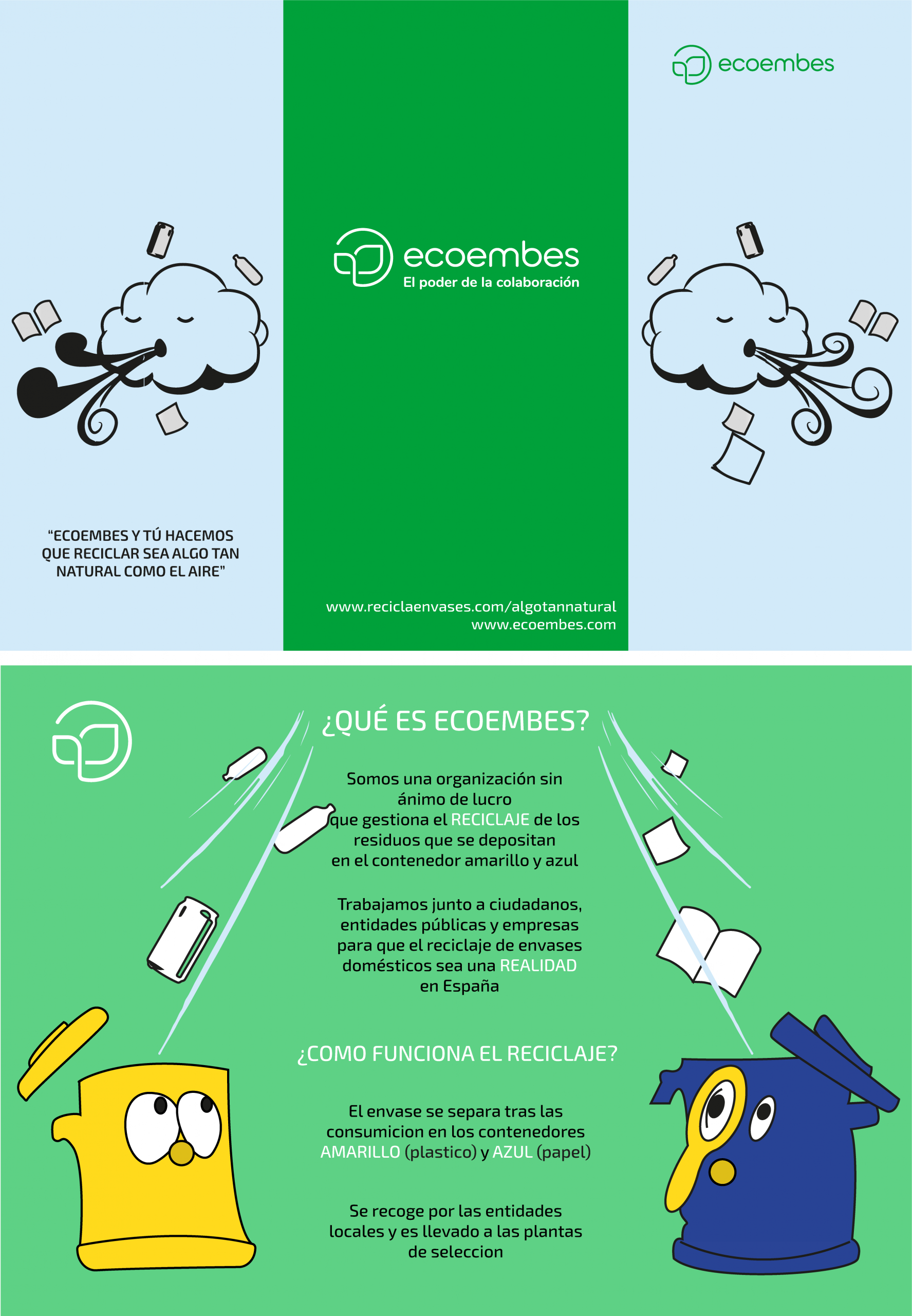 “This project involved designing a small-format trifold brochure, with creative freedom to include die-cuts, and an A3 poster maintaining the visual coherence of the brochure for a unified campaign. The reference format was US letter (A4 folded in three panels), though A5 was also allowed. Key aspects included structural composition, visual balance, and effective use of hierarchy, color harmony, and graphic elements to communicate the campaign message clearly. The final deliverables were prepared according to professional printing standards, including bleed, cut marks, folds, and die-cut considerations. This exercise emphasized functional design, visual consistency, and practical application of branding guidelines, using ECOEMBES logos and identity manual as references.”